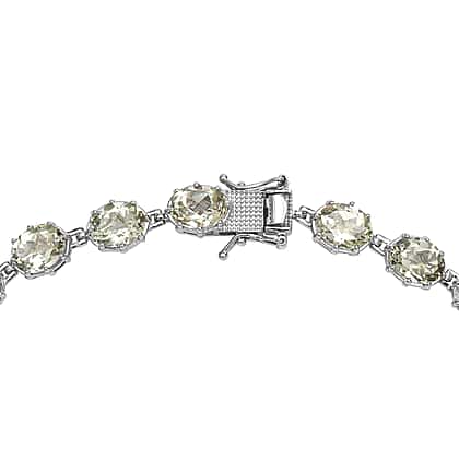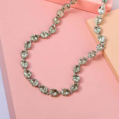 The pastel green hues of rare prasiolites bathe this exotic necklace crafted in fine silver. The prasiolite necklace is made with naturally occurring quartz gems that give it the savoury light green hues. The prasiolites are mounted on prongs and linked as independent stations to create the necklace. Silver body of the necklace sits gracefully and comfortably on your skin. Platinum overlay clothes the Size-20 necklace in a rich sheen.