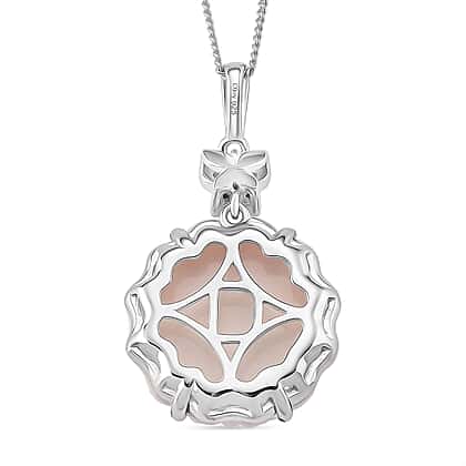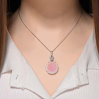 This stunning pendant is a fusion of natural beauty and craftsmanship, featuring a hand-carved Queen Conch shell that forms a soft, blooming floral design with gentle colour transitions from blush pink to cream. Embellished with dazzling white zircons at the top, adding a subtle lift of brightness. Crafted in hypoallergenic 925 sterling silver, this ring offers durability and comfort to sensitive skin. The glossy rhodium overlay provides a mirror-like shine and a polished finish. Paired with a smooth, sleek chain, the design has a soft presence and a noticeable yet gentle profile, suitable for everyday wear as well as more dressed-up moments.