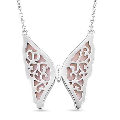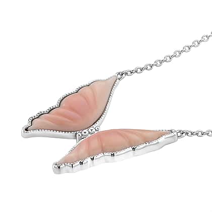 Presenting a butterfly-inspired pendant featuring a soft blush-toned Queen Conch shell forms the two wing-shaped panels, offering a gentle, natural colour with a smooth finish. The shell pieces are neatly framed in rhodium-plated 925 sterling silver, creating a clean outline that enhances the shape. The metal's hypoallergenic nature offers comfort and safety for sensitive skin. Openwork detailing on the reverse keeps the piece light while adding visual interest. Finished with a matching chain and a lobster clasp, the necklace sits comfortably on the neckline and offers secure wear.