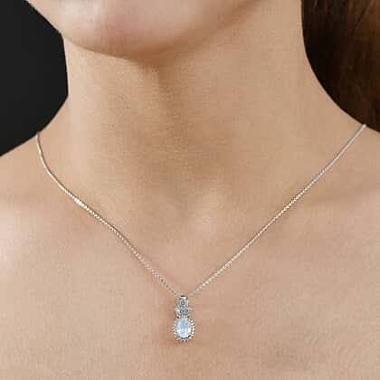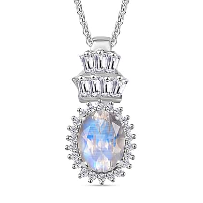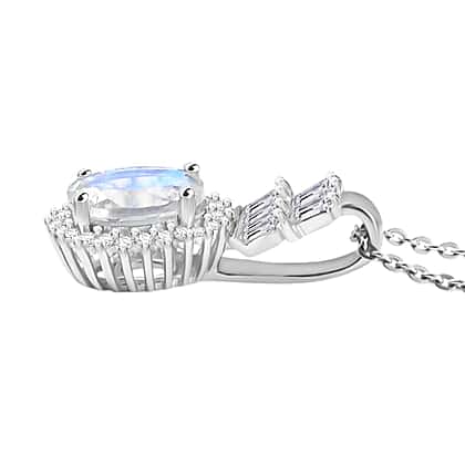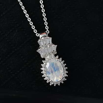 Rainbow Moonstone & White Zircon Pendant with Chain (Size 20) in Rhodium Overlay Sterling Silver 1.75 Ct.