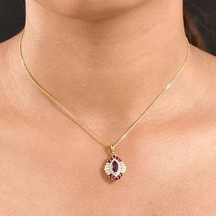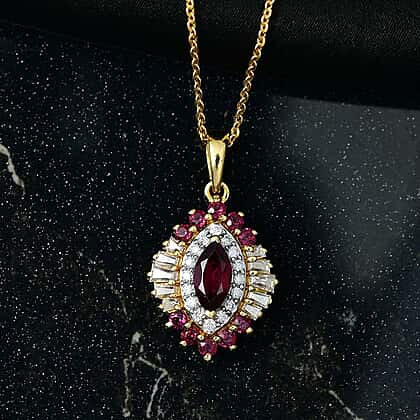 This exquisite piece is crafted to stand out with its rich hue and glamorous design. This pendant features a pear-shaped rhodolite garnet at the centre, known for its deep red hue. The main stone is surrounded by a halo of dazzling moissanite and round rhodolite garnet, creating a floral-inspired design that exudes a mesmerising contrast. Meticulously crafted in 18K vermeil yellow gold over 925 sterling silver, this piece offers durability and enduring shine. The metal has hypoallergenic properties, making it suitable for sensitive skin. Finished with a sleek matching chain and a secure lobster clasp for security and comfort fit. The warm tone finish with extraordinary shine makes the pendant ideal for special occasions and special gifting to your loved ones.
