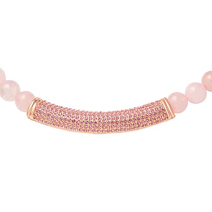 This rose quartz and pink crystal necklace is designed to exude feminine elegance. Studded with 42 rose quartz beads of 9-11 mm, the necklace captivates with a pink crystal-studded centrepiece that is finished with a rose gold tone that complements its soft glow. At Size 20, the necklace falls elegantly between the collarbone and the centre of the bust.