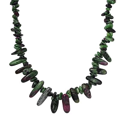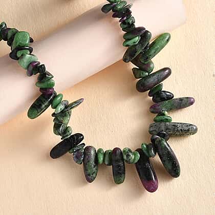 Unconventional and chic, this Ruby Zoisite Necklace exudes bohemian flair. It features a combination of Ruby Zoisite rounds and chips, each carrying a combination of contrasting colours, including red green and black. This gemstone is extracted from rock formations that include ruby crystals, green zoisite and black hornblende. Ruby Zoisite radiates positive energy and enthusiasm, making the necklace a healing piece of jewellery.