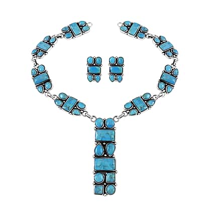 Santa Fe 2 Pc Set 51 Ct Turquoise Necklace in 18 inch and Earrings in Rhodium Plated Sterling Silver