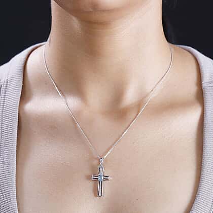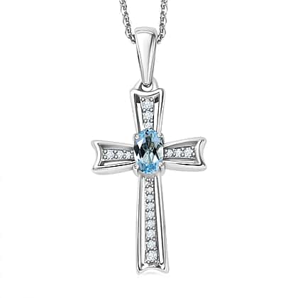 Santamaria Aquamarine & Zircon Cross Pendant with Chain (Size 20) in Rhodium Overlay Sterling Silver