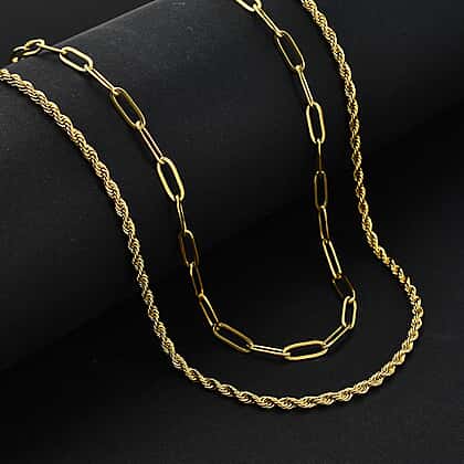 Set of 2 - Paperclip & Rope Necklace in Yellow Plated (Size 22-2 Ext.)