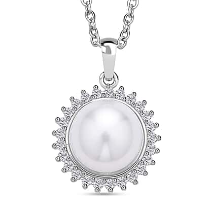 Simulated Diamond and White Fresh Water Pearl Silver Pendant with Steel Chain (Size-20) in Rhodium Overlay Sterling Silver