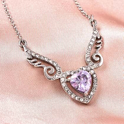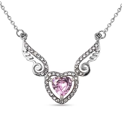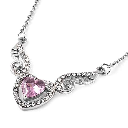 Lustro Stella Heart and Angel Wings Simulated Pink Topaz and White Austrian Crystal Necklace Size 20 in Silver Tone