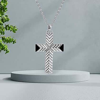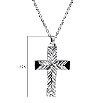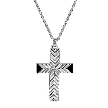 Pattern Cross With Black Agate Necklace in Sterling Silver Rhodium Plated