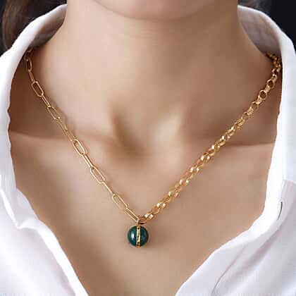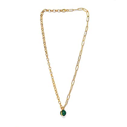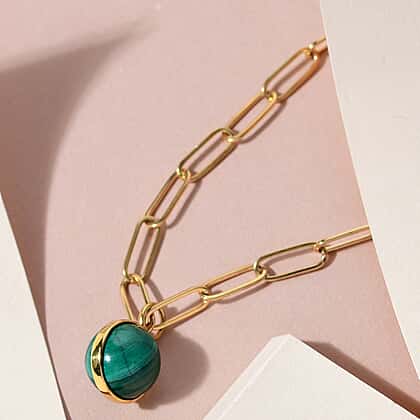 A uniquely designed necklace from Sundays Child that carries a fusion of Belcher and Paperclip chain along with a round faceted cut Malachite. The round cut Malachite add multi-coloured brilliance and fire to the necklace, which is complemented by the robustness of Belcher and Paperclip pattern. A This matinee length necklace is 20 inches long and sits between your collarbone and bust line, making it excellent for layering. A high-quality lobster clasp secures this bracelet in an effective and rapid manner.