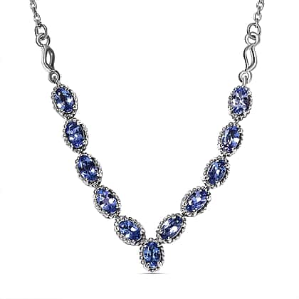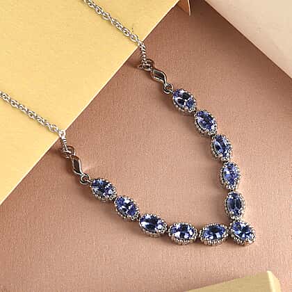 - The necklace is made with 11 faceted tanzanites weighing 2.299 carats.