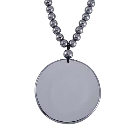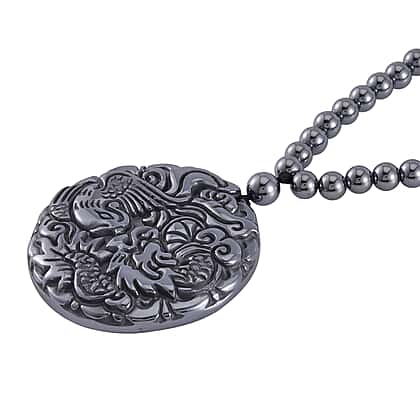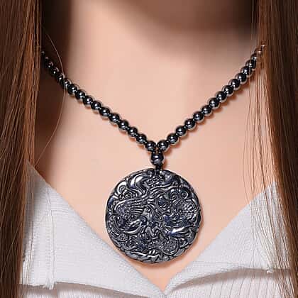 Encompassing strength and fortune, this Terahertz Carved Dragon Medallion Necklace makes a bold accessory. It features a 48mm round Terahertz in a Carving Cut featuring a dragon motif. The intricate details of the dragon, including its swirling clouds and flowing mane, are beautifully brought out by intricate handwork. The medallion is suspended from a chain made up of 87 Terahertz Beads. It is finished with a magnetic clasp in Rhodium Overlay Sterling Silver.