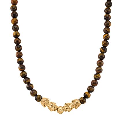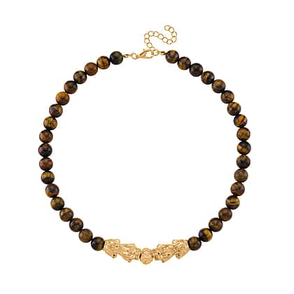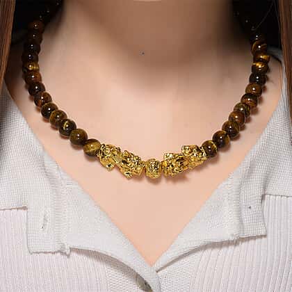 Tigers Eye Beads & Pixiu Necklace (Size 18 - 2 Ext) in Yellow Gold Plated 330.00 Ct.