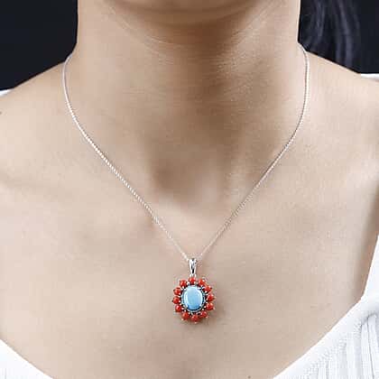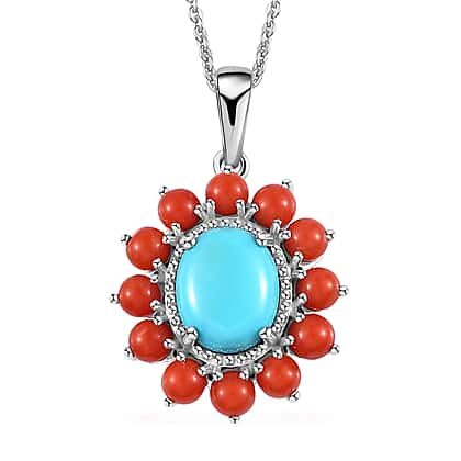 Tucson Special - Arizona Sleeping Beauty Turquoise & Coral Pendant with Chain (Size 20) in Platinum Overlay Sterling Silver 4.48 Ct.