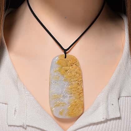 If you are looking for a necklace that can really turn heads, consider adding this jade stone necklace to your jewellery collection. It features a rectangular stone with curved ends exhibiting soft yellow and pastel grey shades. It is meticulously carved with dreamy landscape details that make the piece look totally unique. Its rounded corners and smooth surface feels gentle on the skin, making it easy to wear all day long. The charm comes attached to a simple black cord, which adds a sleek, modern touch to the design.
