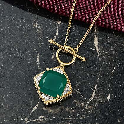 Draped in rich green allure, this Verde onyx necklace captures modern sophistication with a hint of mystique. The 12x12mm cushion-cut Verde onyx, known for its deep forest hue and strength, symbolises grounding and inner balance. Surrounding it, a halo of sparkling white zircons adds a radiant contrast, enhancing the stone’s natural intensity. The pendant is crafted in hypoallergenic, tarnish-resistant yellow gold-plated sterling silver, making it ideal for sensitive skin. Finished with a secure toggle clasp and a 20-inch chain, this piece offers effortless wear and striking presence — a confident expression of refined taste and individuality.