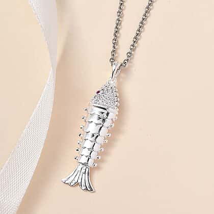 Vicenza Closeout - Articulated Fish Simulated Red and White Diamond Pendant in Platinum Overlay Sterling Silver with Free Chain (Size 20)