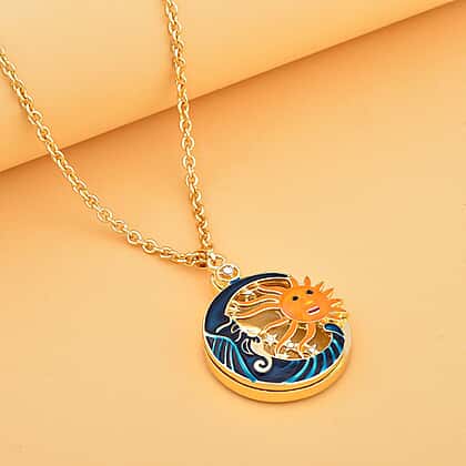 Add a bright touch to your look with this lovely sun pendant that comes with a size 24 chain in gold tone. The white Austrian crystal, black Austrian crystal and magnifying glass pendant is a lightweight and useful accessory. While it beautifully complements your casual looks, the magnifying glass attached to the pendant allows you to read the fine print or small letters on a watch when you are on the move.