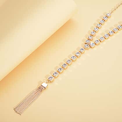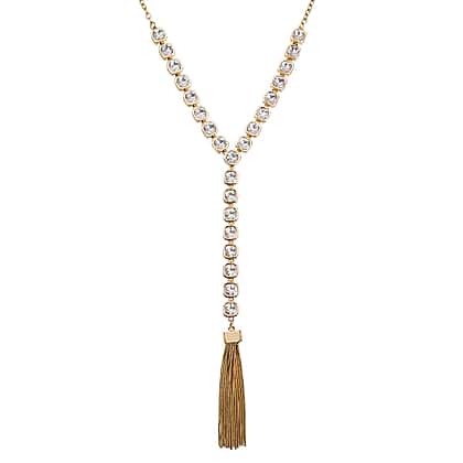 This beautiful white Austrian crystal lariat or Y-necklace necklace gives a classy edge to your look. This necklace features the cushion-cut crystals bezel set in the yellow gold tone frame giving out a luxurious appearance. It is 28 inches long, secured with a lobster clasp, and has a string of beads detailing in the centre for a stylish touch. You can style this necklace with your party gown to elevate the look of your outfit.