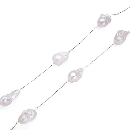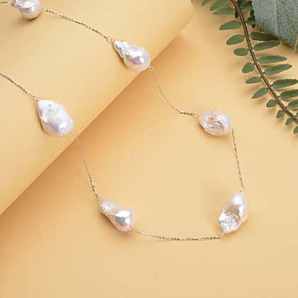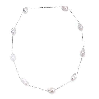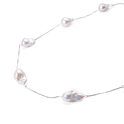White Baroque Pearl Station Necklace (Size - 30) in Rhodium Overlay Sterling Silver