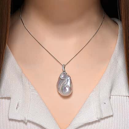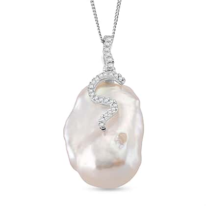 White Baroque Pearl & White Zircon Pendant with Chain (Size 18) with Lobster Clasp in Rhodium Overlay Sterling Silver 44.27 Ct.