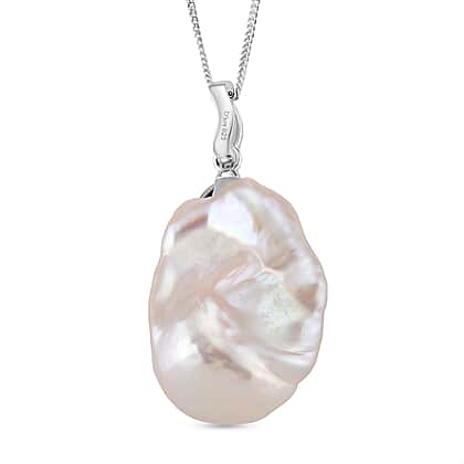 White Baroque Pearl, White Zircon Pendant with Chain (Size 18) with Lobster Clasp in Rhodium Overlay Sterling Silver 44.27 Ct.