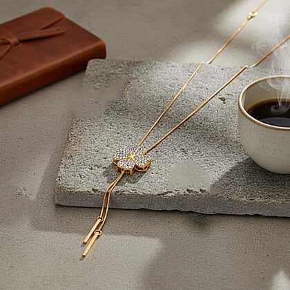 Bring delicate charm to your look with the White Crystal Floral Necklace, a design inspired by blooming forms and graceful detailing. The centrepiece features a four-petal floral motif, intricately set with white crystals that catch the light beautifully. Slim chain extensions fall gently from the floral element, creating a soft drop effect that adds movement and length to the design. The gold-tone finish enhances the brilliance of the crystals while adding warmth and definition, resulting in a piece that feels both refined and eye-catching. Ideal for occasion wear, beautiful styling, and adding a delicate statement to your look.
