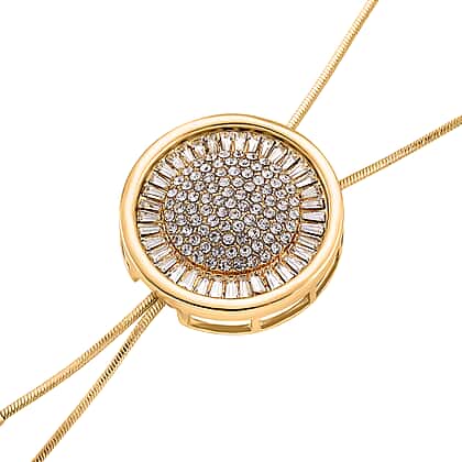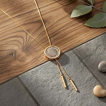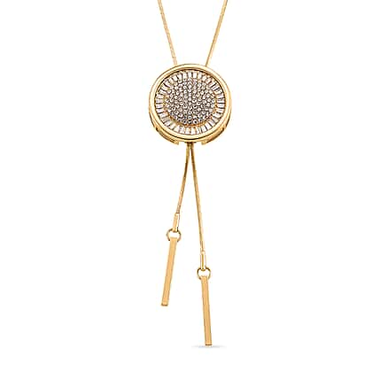 Create a refined focal point with the White Crystal Necklace, designed around a striking circular centrepiece that draws the eye with its detailed composition. The pendant features concentric layers of white crystals, forming a radiant pattern that adds depth and dimension. Fine chain drops extend from the centre, introducing a sleek vertical element that enhances the overall design. The gold-tone finish frames the design neatly, adding warmth while highlighting the precision of the crystal setting. Its adjustable length allows it to sit perfectly with different styles and necklines. Ideal for refined styling, evening wear, and adding a distinctive centrepiece to your look.