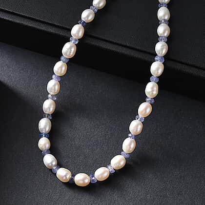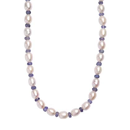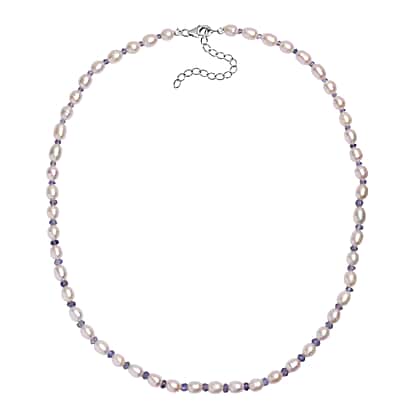 White Fresh Water Pearl & Tanzanite Necklace (Size 18-2 EXT) in Rhodium Overlay Sterling Silver 90.00 Ct.
