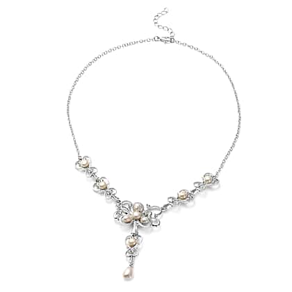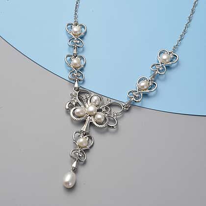 • STONE DETAILS: A number of round-cut White Freshwater Pearls and round faceted cut White Austrian crystals has been studded on this necklace through prongs