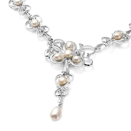 White Freshwater Pearl and White Austrian Crystal Necklace Size 20 in Silver Tone