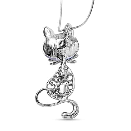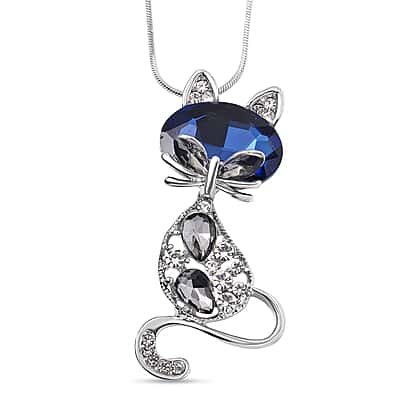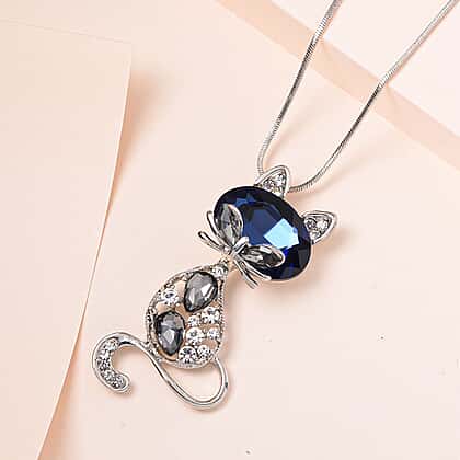 White, Grey & Blue Austrian Crystal Cat Pendant with Chain (Size - 24) in Silver Tone