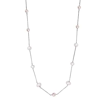 This is a fascinating silver necklace adorned with gleaming pearls, each one delicately spaced along the chain, creating a symmetrical and harmonious design. The spirit of the station necklace has been given an artful display that refines your style with any outfit you choose to pair it with. The station necklace allows each pearl to shine individually while complementing the overall piece. The platinum overlay creates a sizzling look with its niche finish.