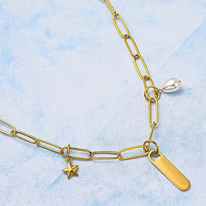 - It features a pear-drop pearl, a star and a dog tag charm connected in the chain