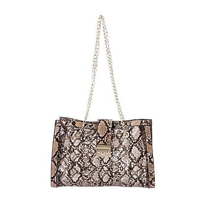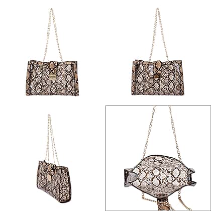 New Arrival- 2 Piece Set Python Skin Pattern Tote Bag (Size 35x10x24cm) with Chain Strap and Pouch Bag (Size 23x8x18cm) - Brown