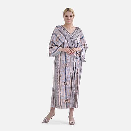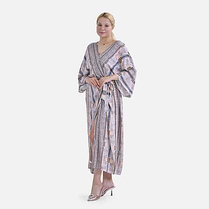 Closeout Deal- Bohemian Style Beige Multi-Stripe Long Wrap Kimono (One Size)
