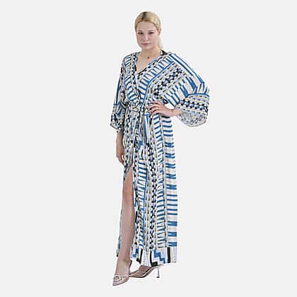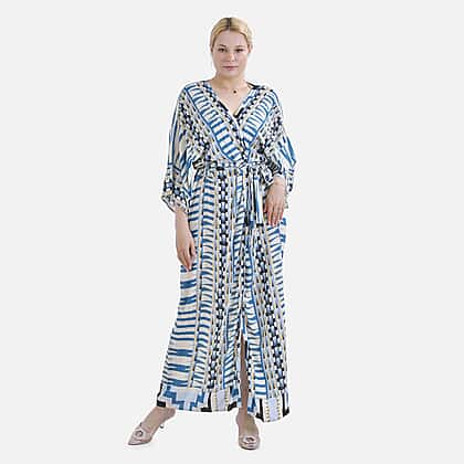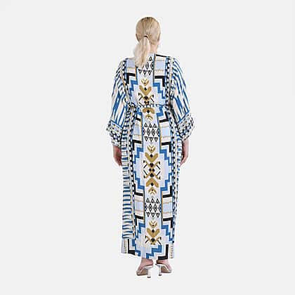 Make sunny days even more relaxed with this tribal-inspired blue kimono. Designed in soft viscose, it keeps you feeling fresh and stylish from beach mornings to evening lounging. The cooling fabric drapes effortlessly, while the vivid tribal detailing adds a splash of artistic flair. Cut in a flowing maxi silhouette with three-quarter sleeves, it offers ease of movement and confident coverage. The adjustable drawstring cinches the waist just right, adding shape without sacrificing comfort. Whether you're layering over swimwear or styling it for a casual day out, this kimono feels light, easy, and beautifully put together.