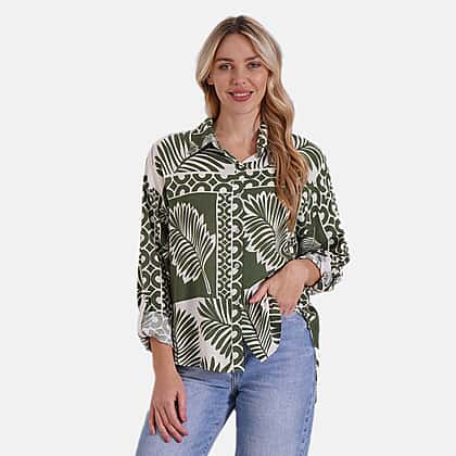 Elevate your casual style with this Tamsy leaf and abstract design long sleeve button-down shirt, a perfect blend of comfort and creativity. Showcasing a beautiful mix of olive green and cream prints, it combines leaf and geometric motifs for an artistic finish. Made from 100% viscose, it feels smooth, airy, and comfortable for all-day wear. The loose fit drapes gracefully, while the roll-tab sleeves, classic collar, and curved hemline add versatility and polish. Whether worn buttoned up or layered over a cami, this piece effortlessly transitions from casual outings to relaxed office days.