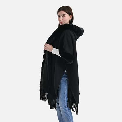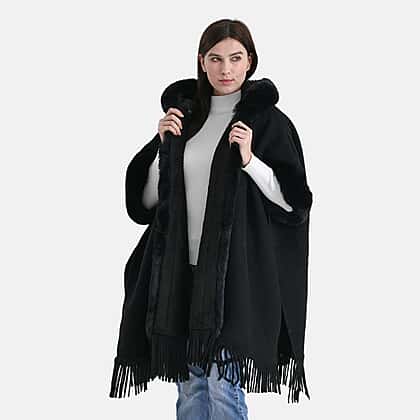La Marey Signature Faux Fur Poncho with Tassels (110 x 90 cm) - Black