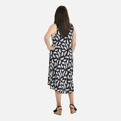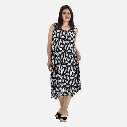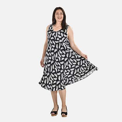 Tamsy 100% Viscose Leaf Pattern Umbrella Midi Dress (One Size) - Black & White