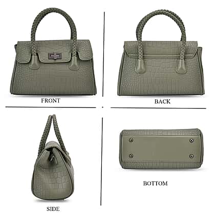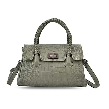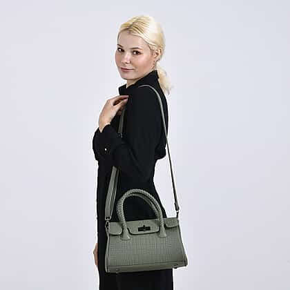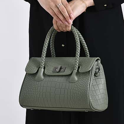 Add a touch of bold charm with this green croc-effect crossbody bag, complete with a beautifully braided top handle. The striking shade brings standout appeal to a structured design that doesn’t compromise on function. Crafted with leatherette walls and a soft polyester interior, this bag features two interior zipped pockets, two slip pockets, and additional secure storage on the exterior. The turn-lock closure keeps your belongings safe, while the bottom studs offer added support and style. With an adjustable, detachable strap, this accessory adapts effortlessly to your everyday needs and bold fashion choices.