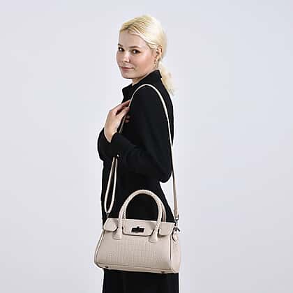 Neutral and easy to style, this Elegant Croc Pattern Crossbody in beige offers a smart blend of form and functionality. The soft croc-textured leatherette exterior is paired with a classic braided handle and turn-lock fastening, giving it a refined feel. With one zipped and one lock pocket outside and four compartments inside, it keeps all your essentials within reach. The structured body helps it maintain shape while bottom studs protect against everyday surfaces. Whether carried by the handle or worn with the adjustable strap, it’s the go-to piece that complements any casual or elevated outfit.