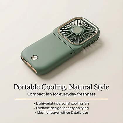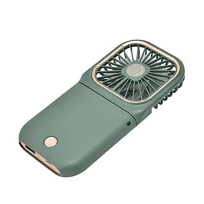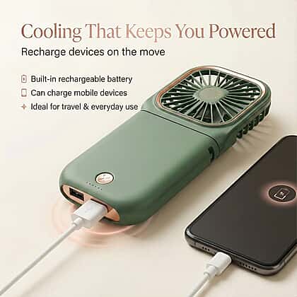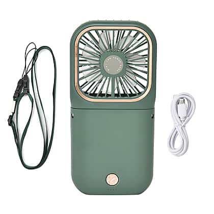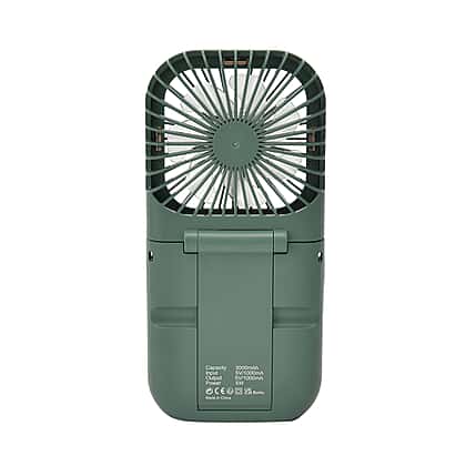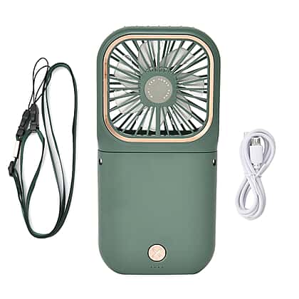 Foldable & Rechargable 3 Speed Fan, Phone Holder, Power Bank with Neck Strap (Works upto 8hrs)- Green