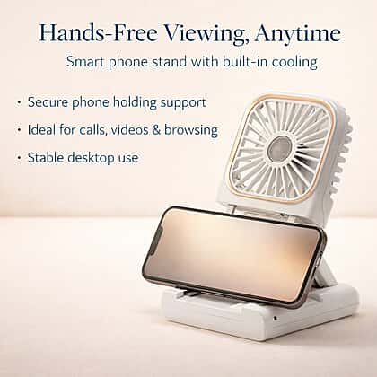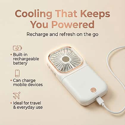 Foldable & Rechargable 3 Speed Fan, Phone Holder, Power Bank with Neck Strap (Works upto 8hrs) - White