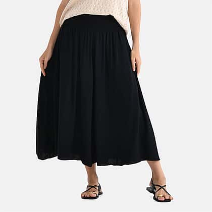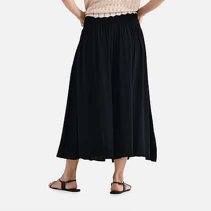 Bring an effortlessly polished look to your everyday wardrobe with these Tamsy relaxed fit smocked waist culottes in solid black. Made from soft, breathable 100% viscose, they drape beautifully and feel light against the skin. The wide-leg cut moves gracefully, while the elasticated smocked waistband offers a flattering fit and lasting comfort. Versatile enough for both smart and casual wear, these culottes can be dressed up with a blouse or kept simple with a tee. A timeless staple that combines ease, elegance and all-day comfort in one stylish design.
