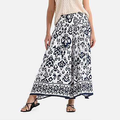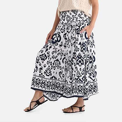 Step into effortless style with these Tamsy relaxed fit bohemian print smocked waist culottes, crafted from 100% viscose for a lightweight, breathable feel. The white base with elegant blue patterns gives a laid-back yet chic look, perfect for warm days or relaxed evenings. Designed with a wide-leg silhouette and soft, elasticated smocked waistband, they offer comfort and ease of movement. Whether paired with sandals or wedges, these culottes bring a touch of boho charm to your wardrobe—ideal for holidays, casual lunches, or simply relaxing in style at home.