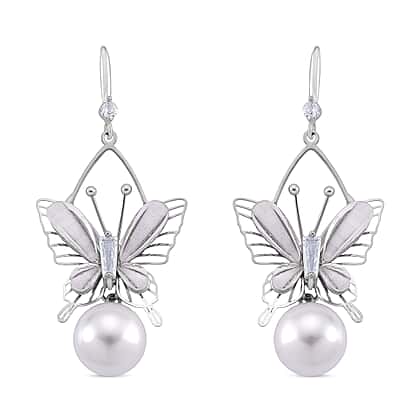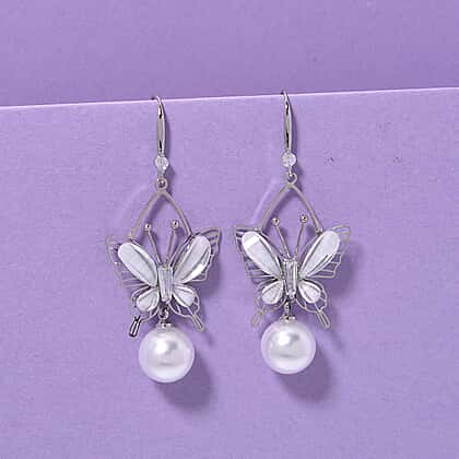 White Cubic Zirconia & White Shell Pearl Dangling Earring with Hook in Silver Plated