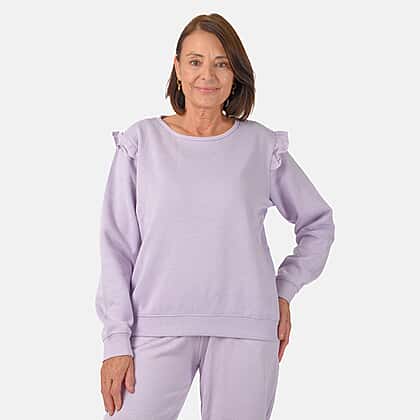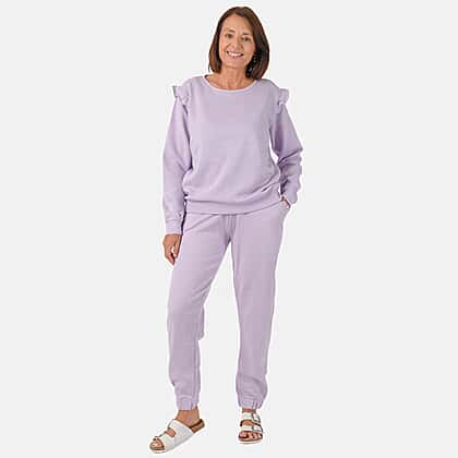 Relax in effortless style with the Nova of London frill sleeve lounge set in lilac, a perfect blend of comfort and elegance. Crafted from smooth polyester, this cosy loungewear set offers a soft feel against the skin while keeping you stylish at home or on the go. The top showcases a graceful round neckline paired with charming frill accents on the sleeves, adding a touch of femininity. The matching joggers feature an elasticated waistband and ankle cuffs, ensuring a relaxed yet flattering fit. Ideal for cosy nights in or easy daytime wear, it’s your all-season wardrobe staple.