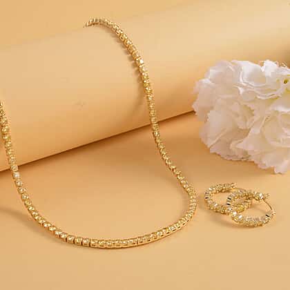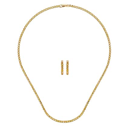 Create a luxurious addition to your outfits with this simulated yellow diamond necklace and earrings set, allowing everyone to covet its charm and be flattened by its beauty. This set is crafted using pure brass inspired by the famous tennis design. The brass links, interconnected to complete the shank, create a solid base for the round free-faceted-cut simulated yellow diamond pieces in both necklace and earrings. This creates a charming hue around your head and is complimented by the yellow-gold tone.