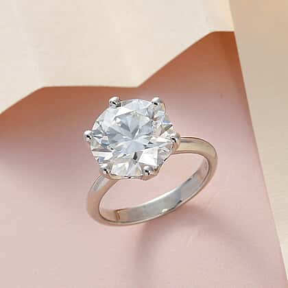 Moissanite, similar in fire and brilliance to a diamond but easier on the pocket, is the perfect choice to celebrate the milestones in your life. This gorgeous Moissanite Solitaire Ring is set in 4.96 grams of silver with a platinum overlay to emit a look of luxury. The centre stone, weighing 7 Carat, boasts a vintage European cut with a small circle at the centre of the stone surrounded by 58 brilliant facets.